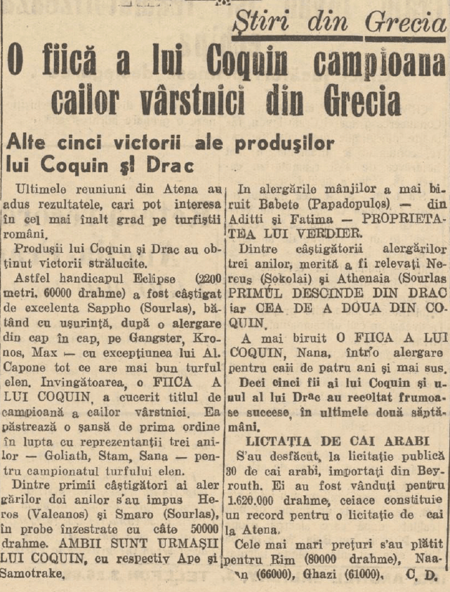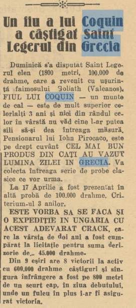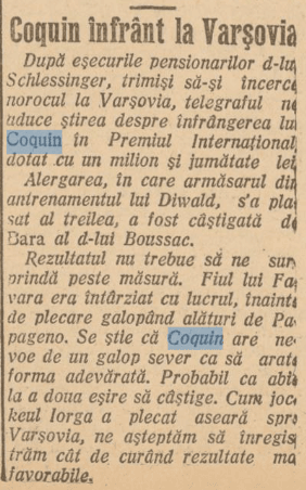 Întors în țară, COQUIN participă la ultima sa cursă de pe Băneasa. Premiul General Gh. Manu (2300 m) din 1931 – câștigător COQUIN!