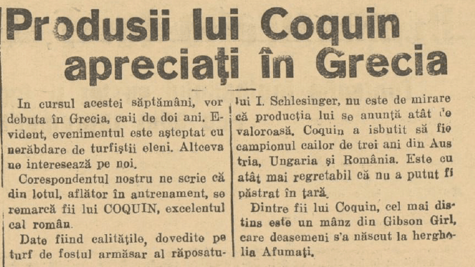 COQUIN a fost unul dintre puținii cai care s-au ridicat la nivelul marelui ZORI DE ZI. Dar, din nefericire, România nu s-a bucurat prea mult de valoarea acestui cal deoarece la finalul anului 1932 toată herghelia Schlesinger a fost vândută în Grecia! A fost un interes pragmatic al antipaticului Schlesinger.