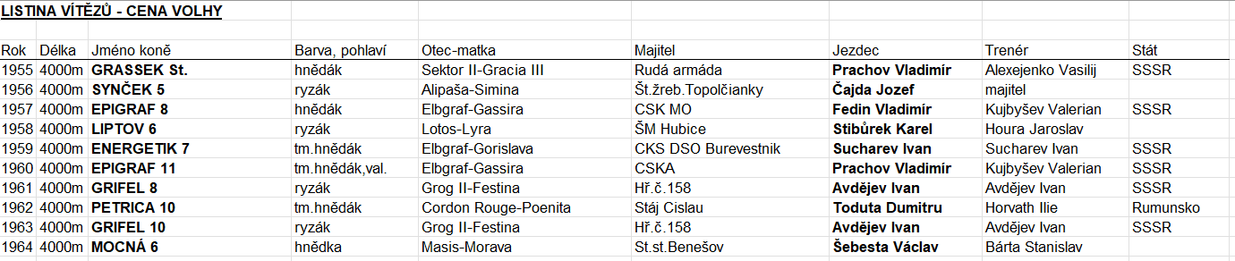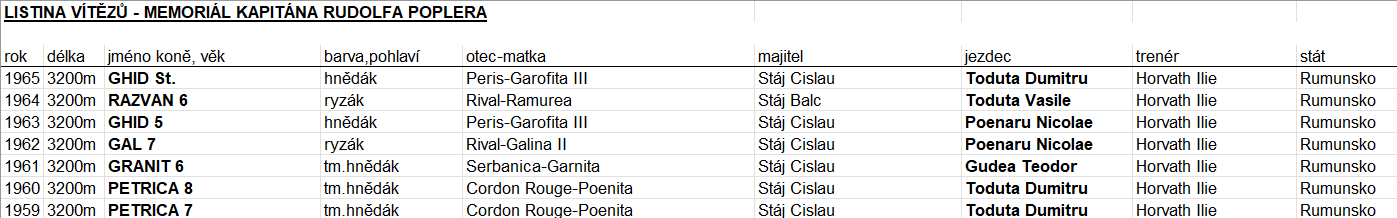 Și au început din 1959. Un debut fulminant în celebrul premiu MEMORIÁL KAPITÁNA RUDOLFA POPLERA, pe distanța de 3.200 m. A fost o serie începută de calul PETRICĂ, câștigător de DERBY ROMÂN în 1955. Il vedem și pe GAL, campionul DERBY ROMÂN din 1958.