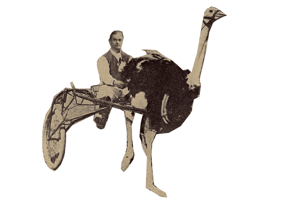 Aceasta este o fotografie cu struțul Blitz (‘Fulgerică’) și driver-ul Fritz Kortner făcută la Hipodromul Floreasca în anul 1933.